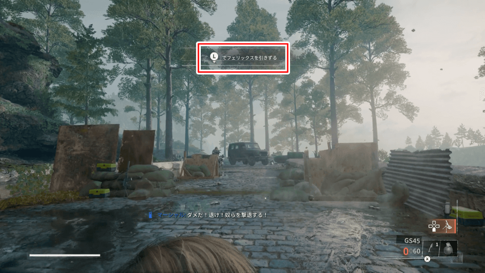 爆薬を設置し終えるとフェリックスが撃たれるため、フェリックスを助けに行こう。近付くと引きずれるので、引きずって爆発の範囲から離れると防衛パートが終了する。