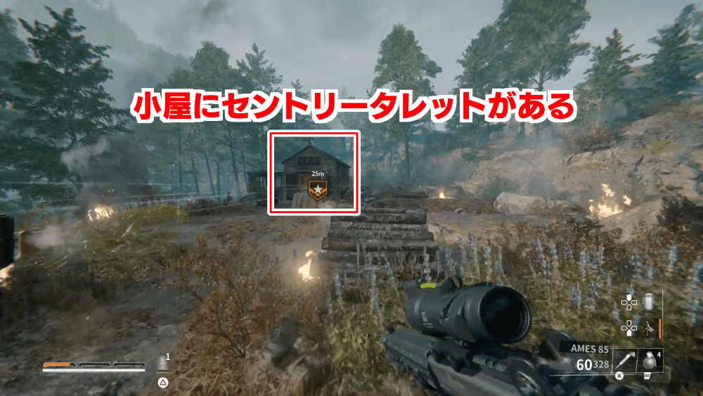 周辺の敵を倒したら、小屋にあるセントリータレットを配置する。セントリータレットは小屋の奥に置き、ヘリから来る増援の対処に当てよう。
