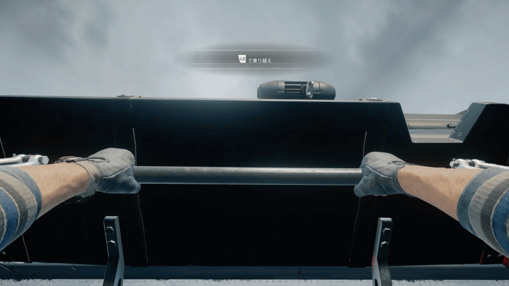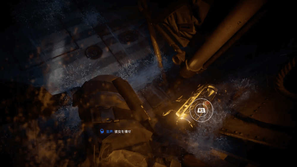 そのまま進むと、ロープがクレーンに引っかかる。QTEが発生するので、R1ボタンを押してロープを切ろう。