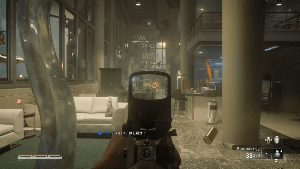 グラップリングフックを入手したら、アサルトライフルで障害物や敵を倒しつつ、ドアまでたどり着こう。ドアを開けると、場面がオフィスに戻る。