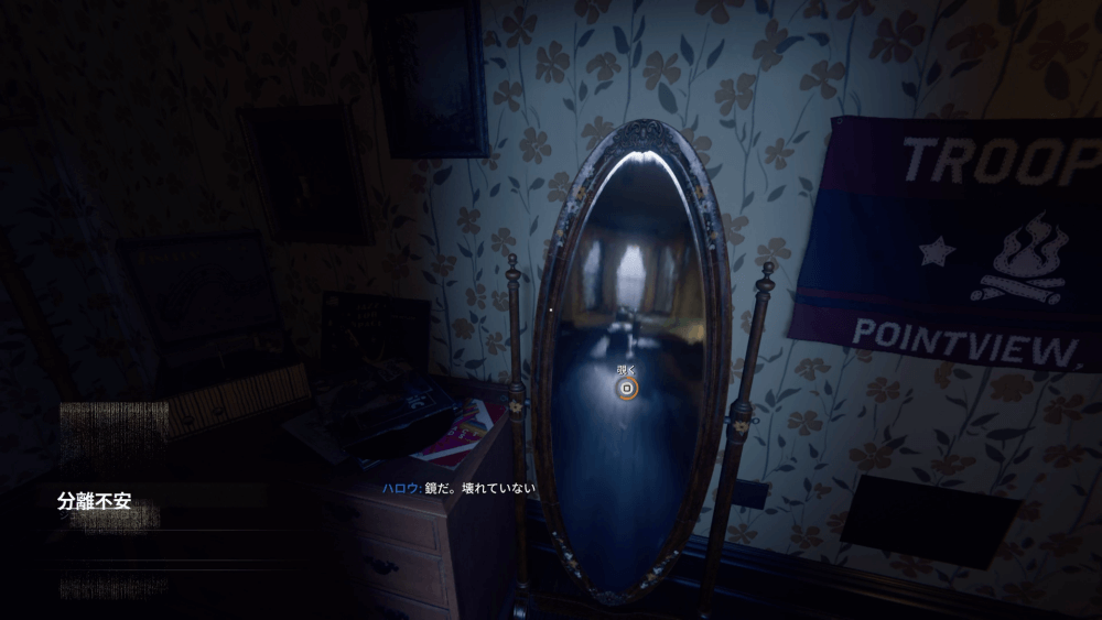 場面が切り替わって女の子の視点になったら、母親の言う事を聞いてベッドの下に隠れる。隠れると再び場面が戻るので、目の前の鏡を調べよう。