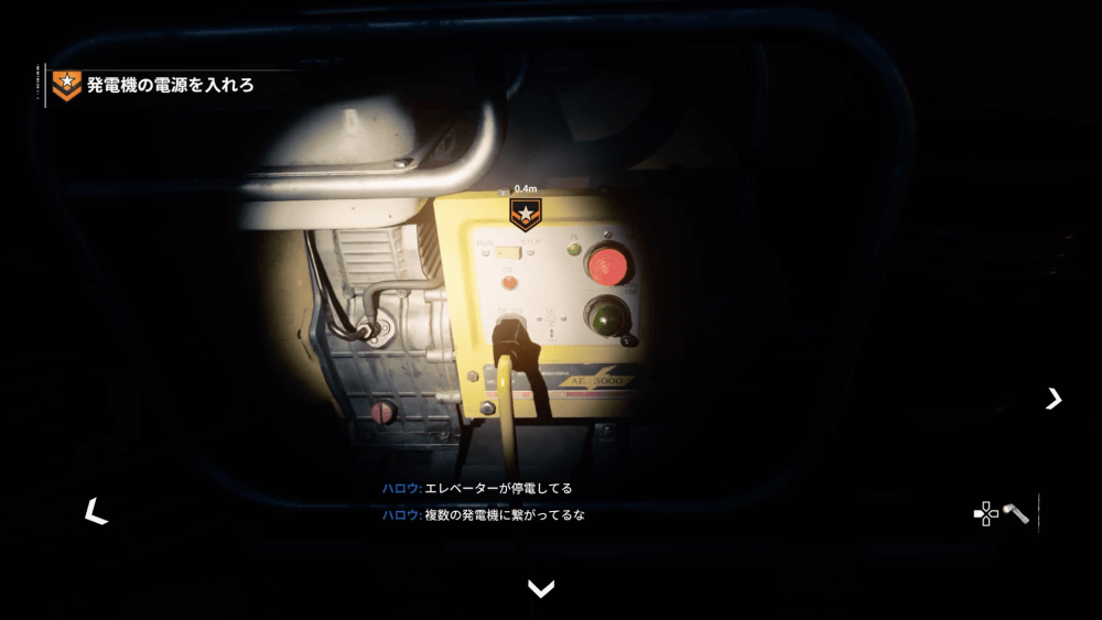 下に降りたら、マーカーを頼りに4つの発電機の電源を入れる。敵も出現するので、ハンドガンで処理しながら電源を入れてまわろう。