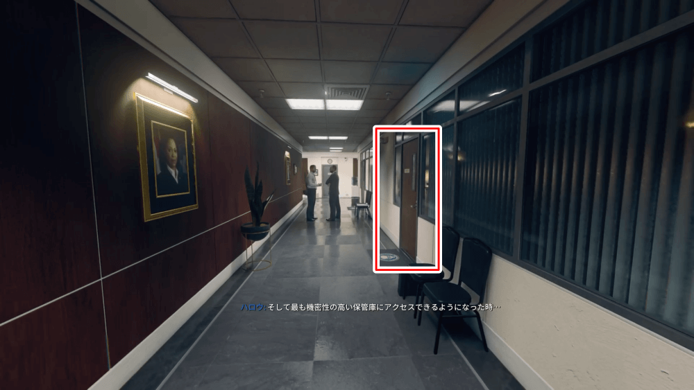 APCを破壊したら、再びハロウの操作に戻る。ドアを開けるとオフィスに入るので、奥に進んでドアを開けよう。ドアに手を掛けると、場面が切り替わる。
