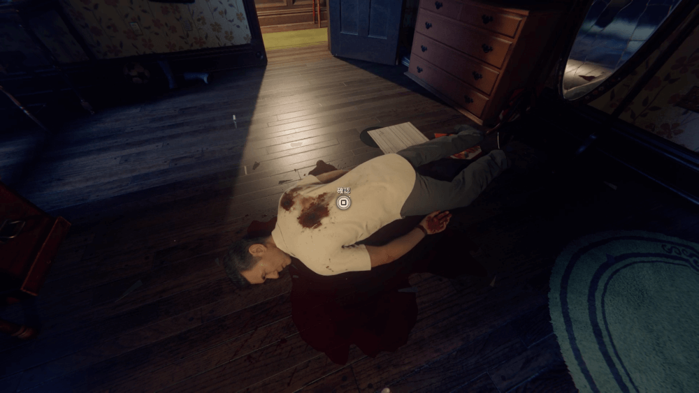 暗号を入力すると文書が表示され、閉じると幼少期の記憶に切り替わる。クローゼットから出て、父親の死体を確認しよう。