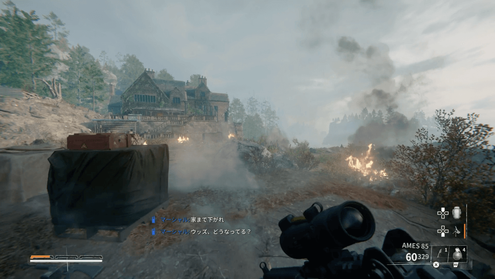 小屋の周囲を殲滅したら、敵のスモークを合図に家まで下がる。ミニガン持ちの兵士たちが来るので、家の周囲で装備を整えよう。