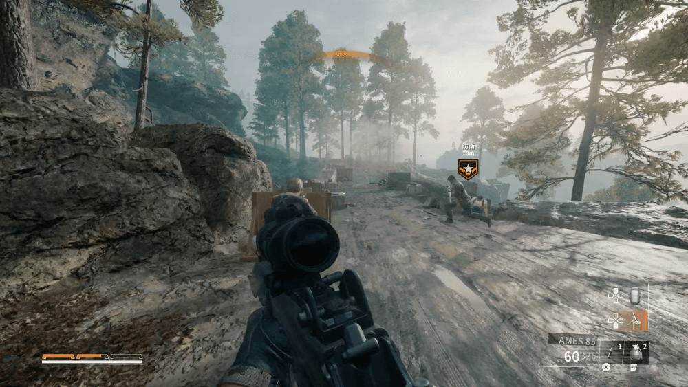 幼少期の記憶が途切れると、場面が切り替わってセーフハウスの防衛が開始する。壁の向こうに爆薬が仕掛けられているので、敵が来たタイミングで起爆すると敵の数を減らせる。