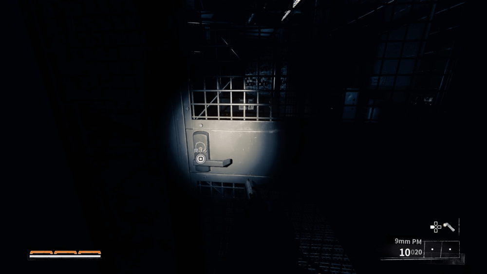 場面が切り替わったら、ライトを点けて道なりに進もう。目の前のドアを開き、道なりに進むと道が崩れて落下する。