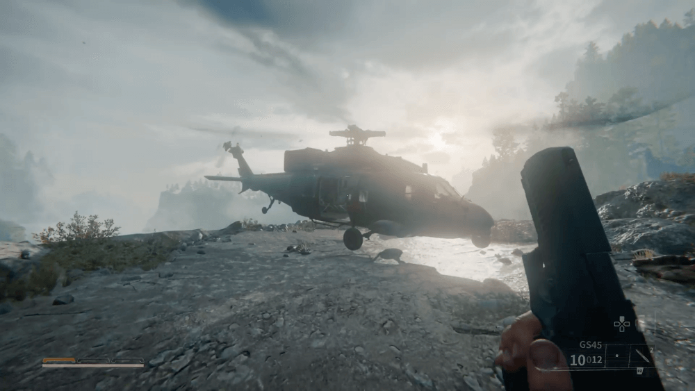 セーフハウス周辺の敵を倒して家の中まで進むと、逃げるヘリが見えるので、追いかけてヘリに掴まろう。飛び立つヘリに近付くと、自動的にヘリに掴まってくれる。