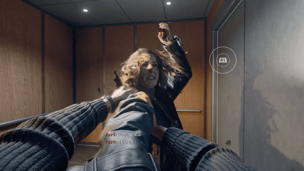 死体を確認すると再び場面がオフィスに戻るので、ハロウの話を聞きながらエレベーターまで進もう。エレベーターに入り、操作が可能になったらボタンを押すとQTEが発生する。R1ボタンでハロウを倒すと、場面が切り替わる。