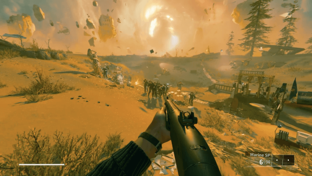 ロープが切れたら、迫ってくる敵を倒しながら前に走る。足を止めると死んでしまうため、正面のヘリまで走り続けよう。