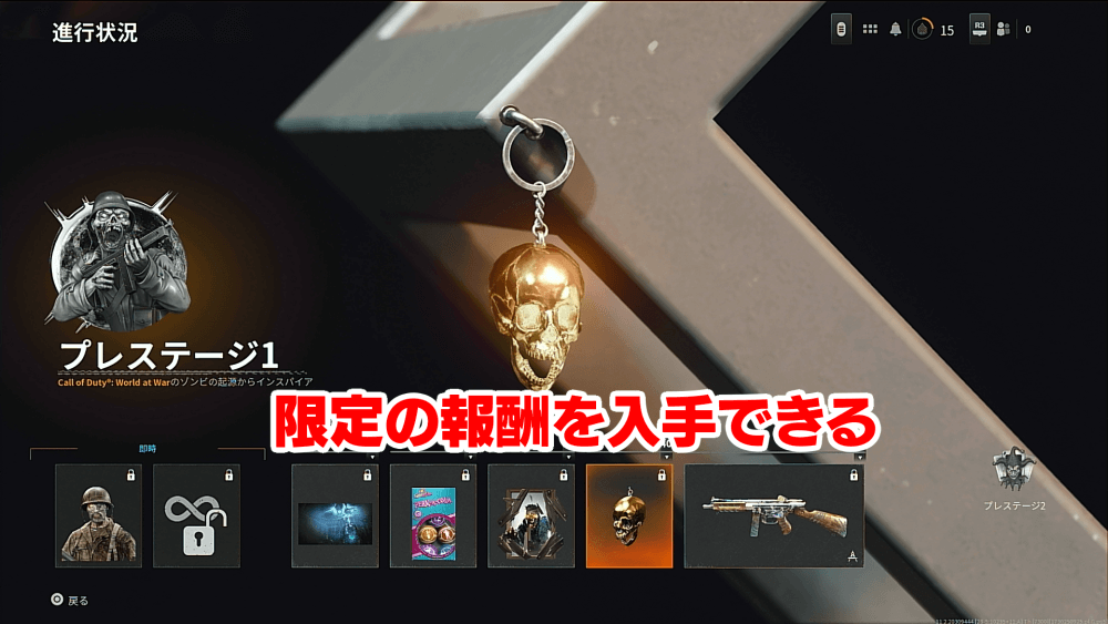 プレステージを進めると、限定のエンブレムやチャームなどの報酬が得られる。やり込みの証にもなるので、欲しい報酬がある場合にはレベルを上げて獲得を目指そう。