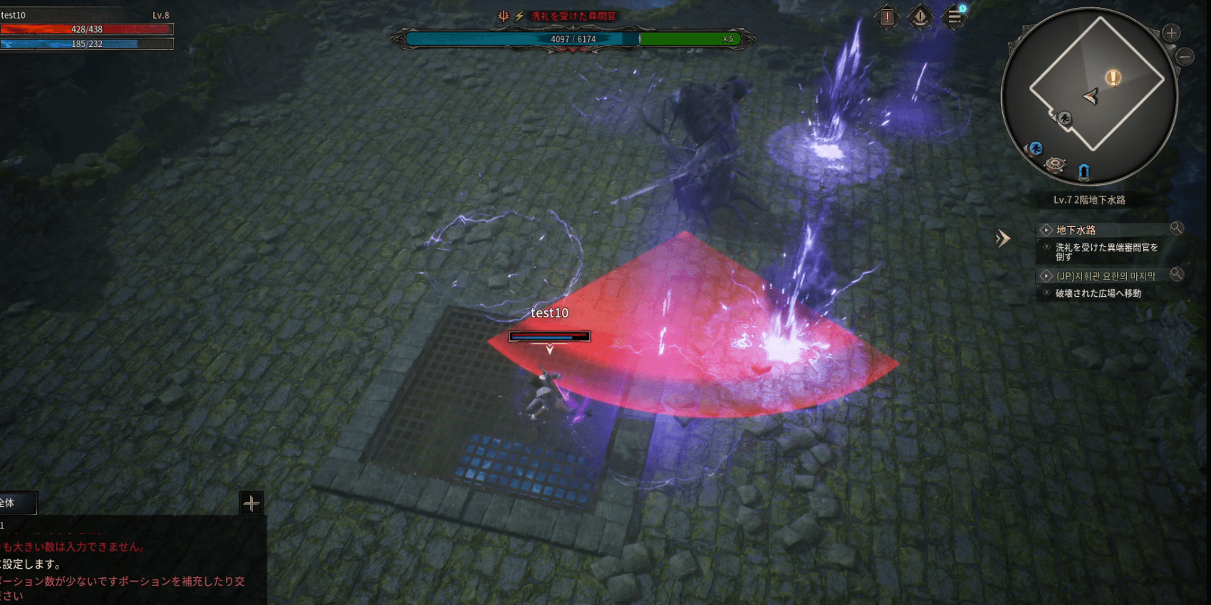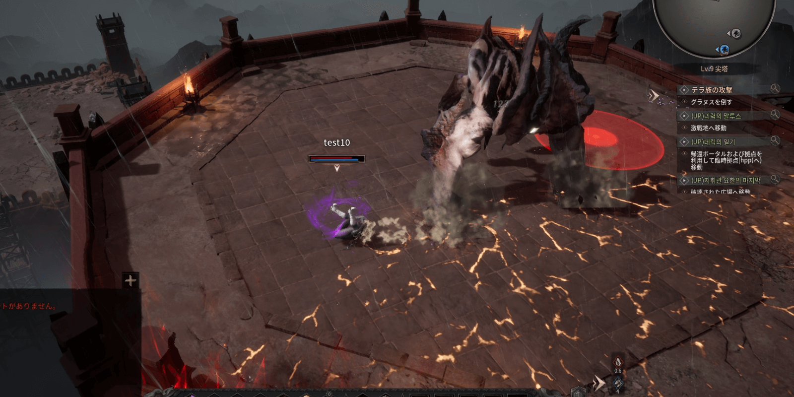 体力の減った中盤以降は、常時戦闘エリア内のランダムな場所に落雷攻撃をしてくる。当たることはあまりないものの、自キャラ付近に赤い丸が見えたら攻撃が飛んでくる合図なので、素早く移動して攻撃範囲外に逃げよう。
