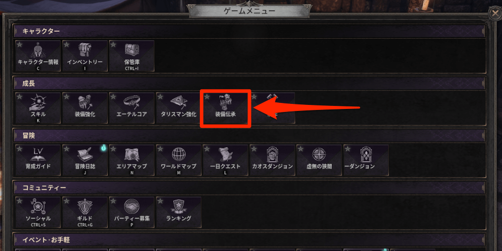 | 1 | メニューまたは錬成台から「装備伝承」を選択 |