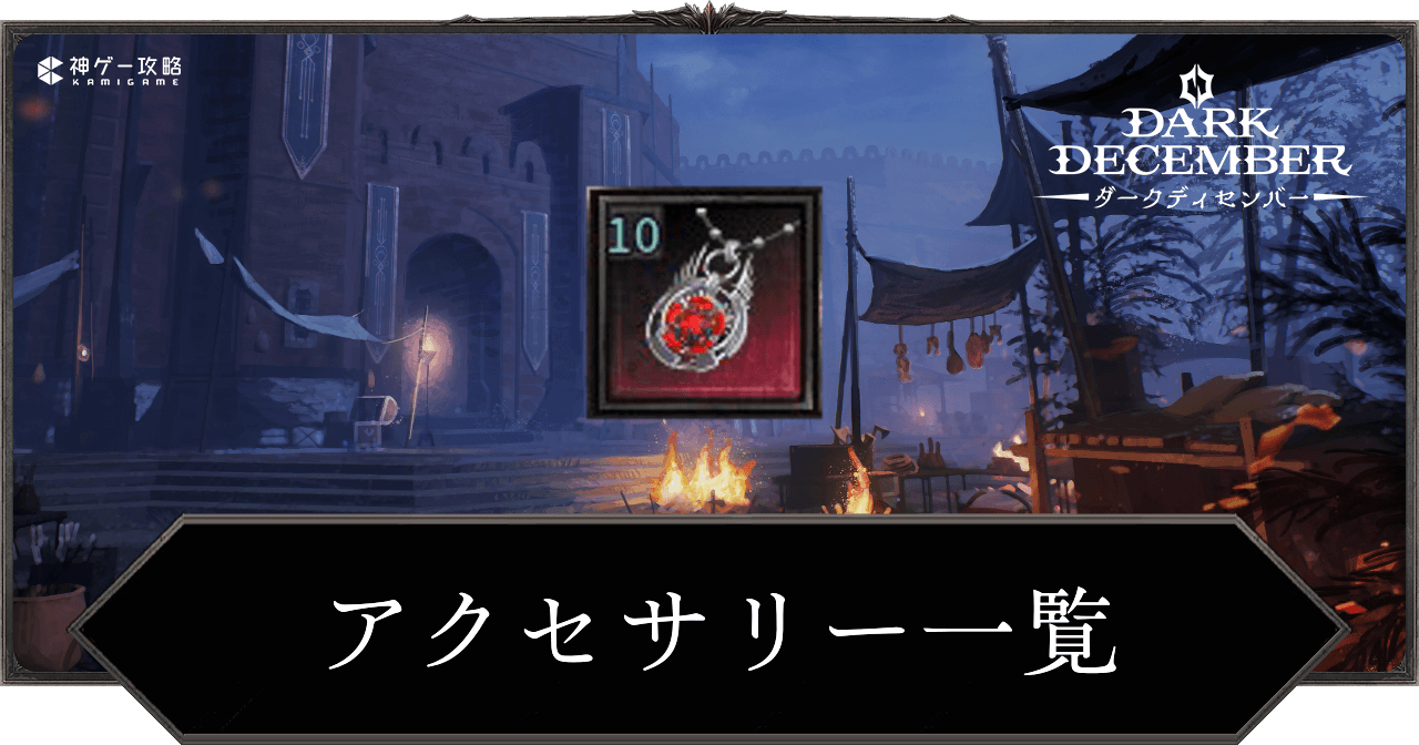 ダークディセンバーのアクセサリー一覧を紹介。種類別にレアリティや効果について掲載しているため、ダークディセンバーでアクセサリーについて知りたい時の参考にどうぞ。