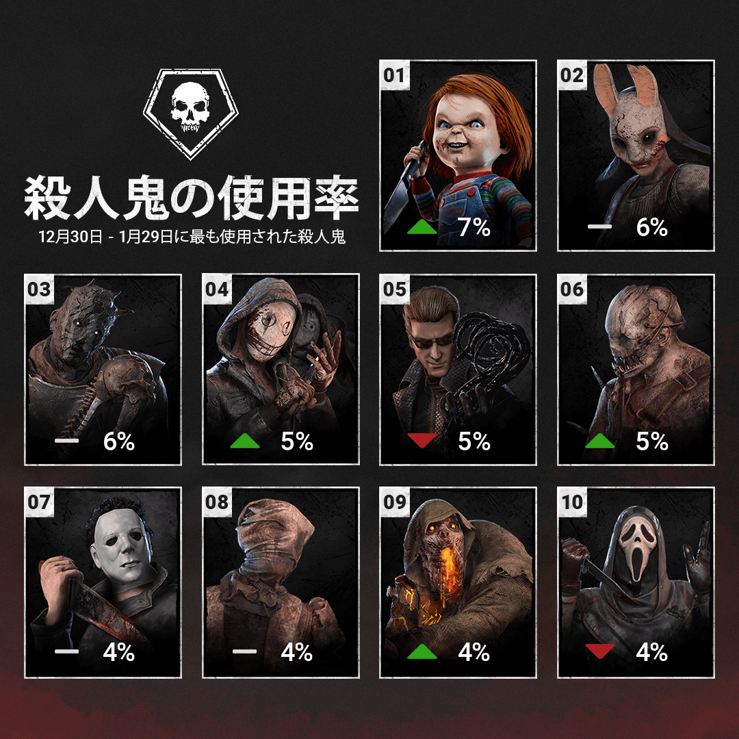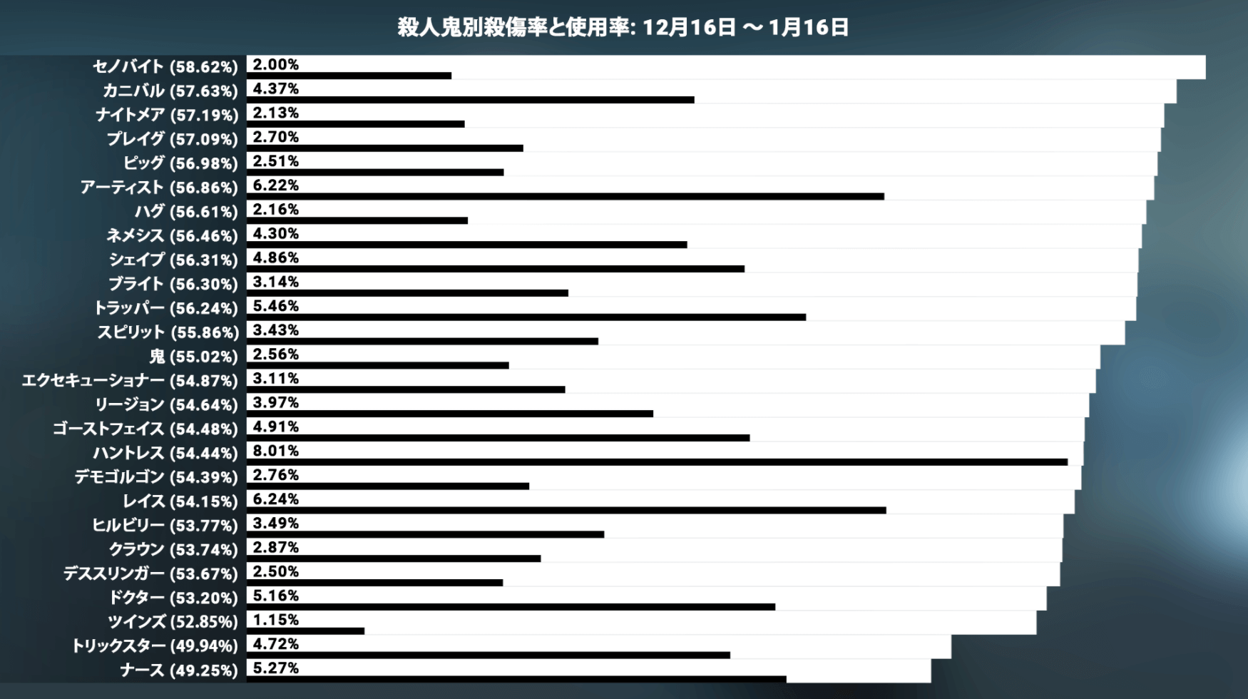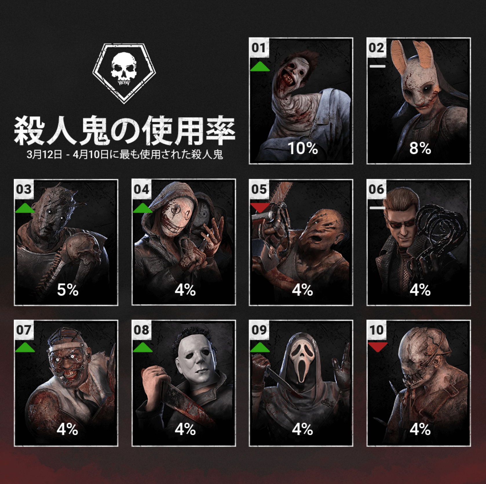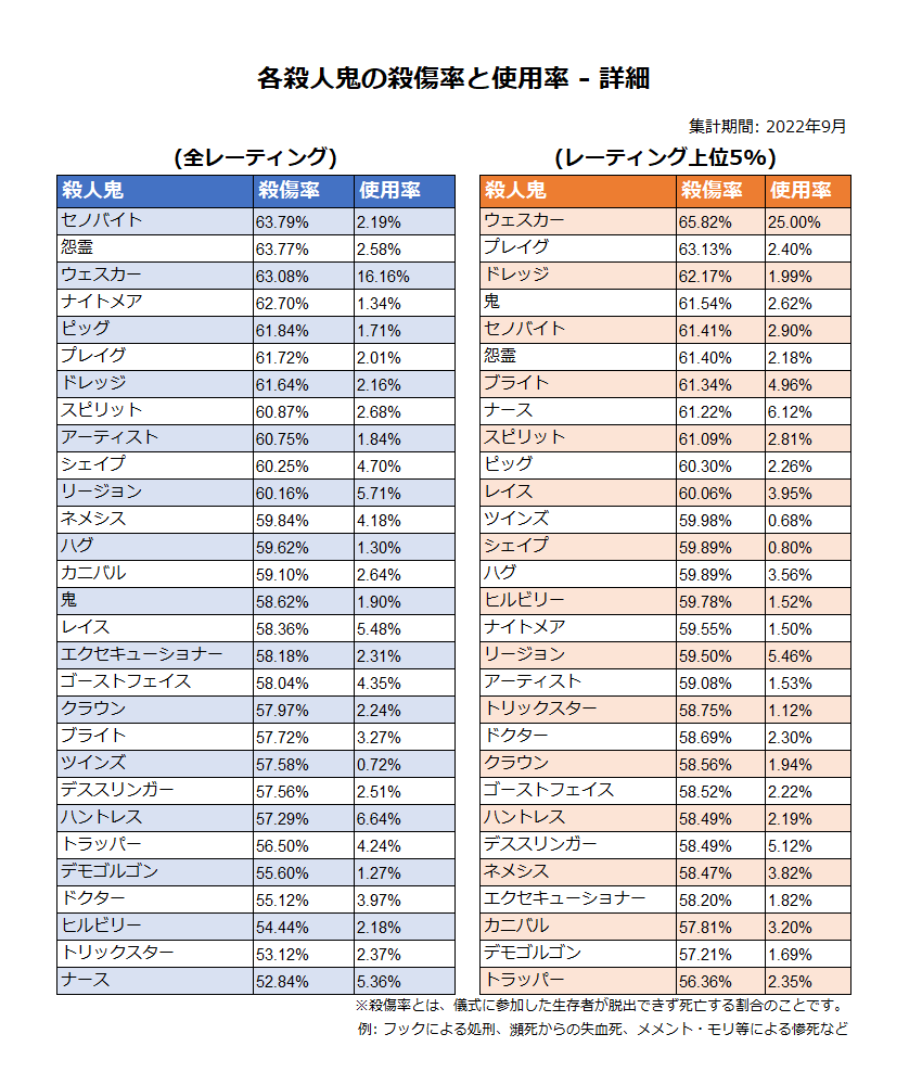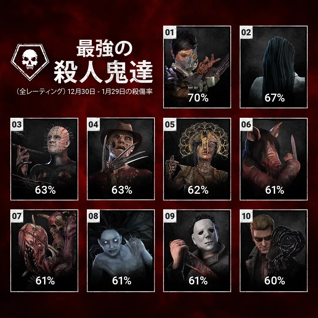 DbD(デッドバイデイライト)におけるキラーの殺傷率と使用率をランキング形式で掲載中!過去の全ランク(全プレイヤー)版と赤帯(ランク1~5)版、レーティング版の表に分けて掲載しているため、DbDで最新のキラー情報を知りたい方は是非参考にどうぞ!