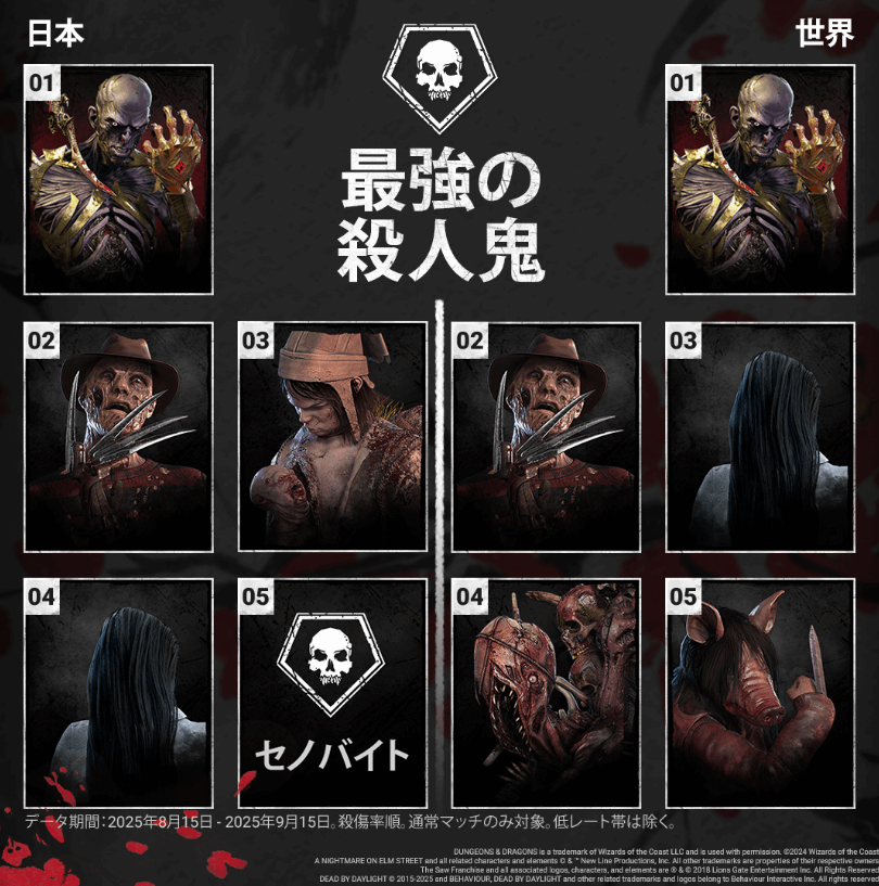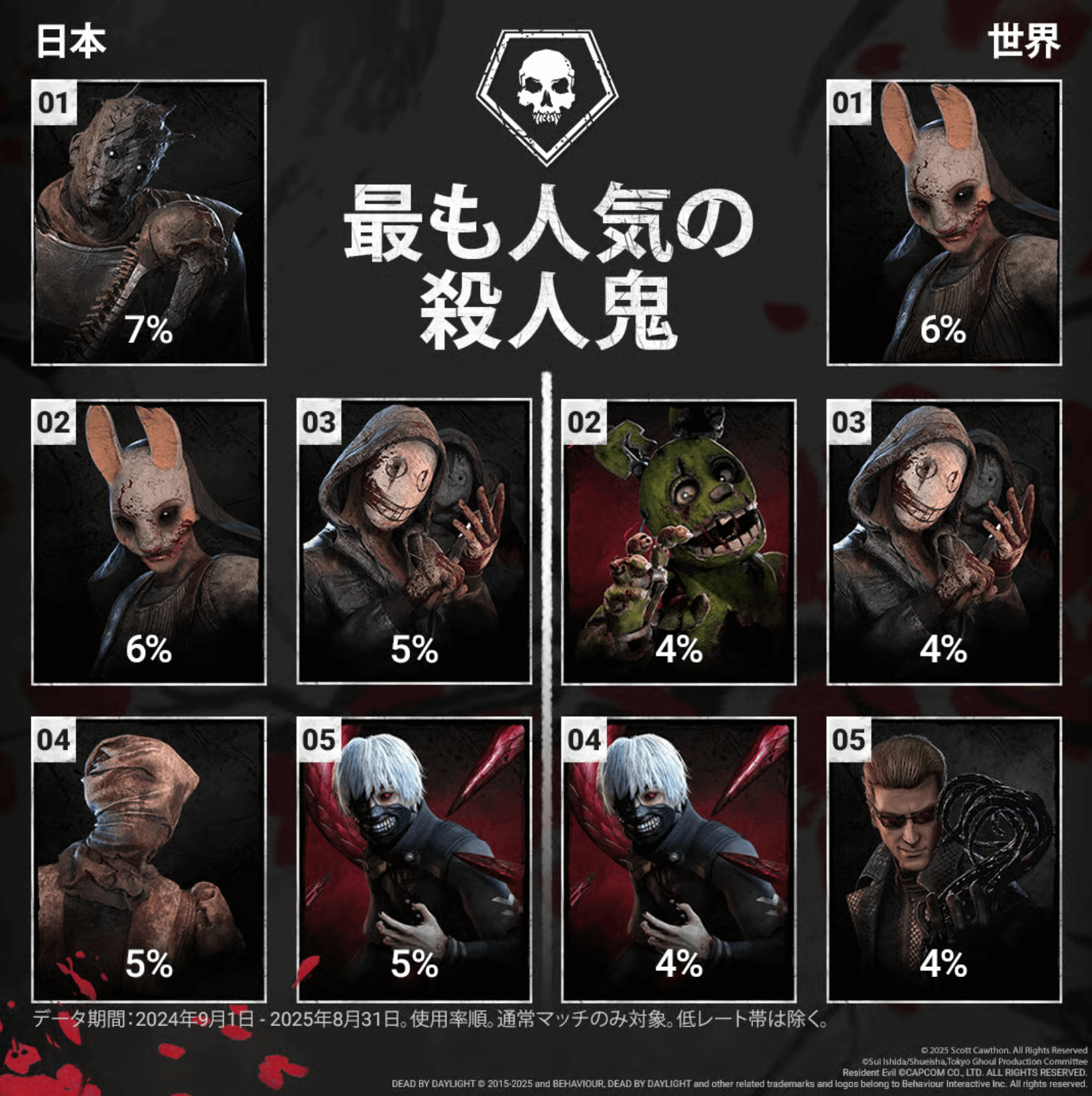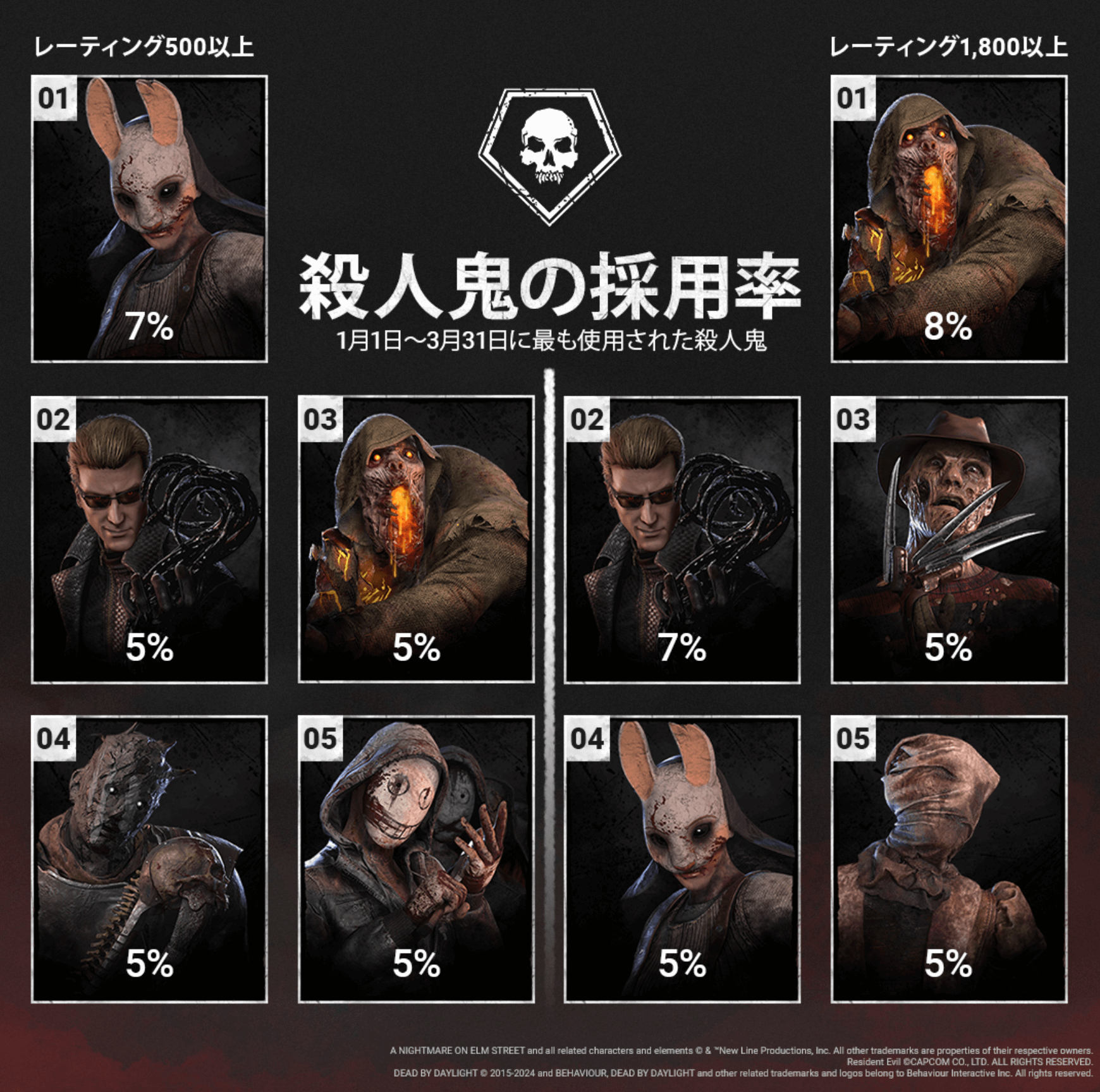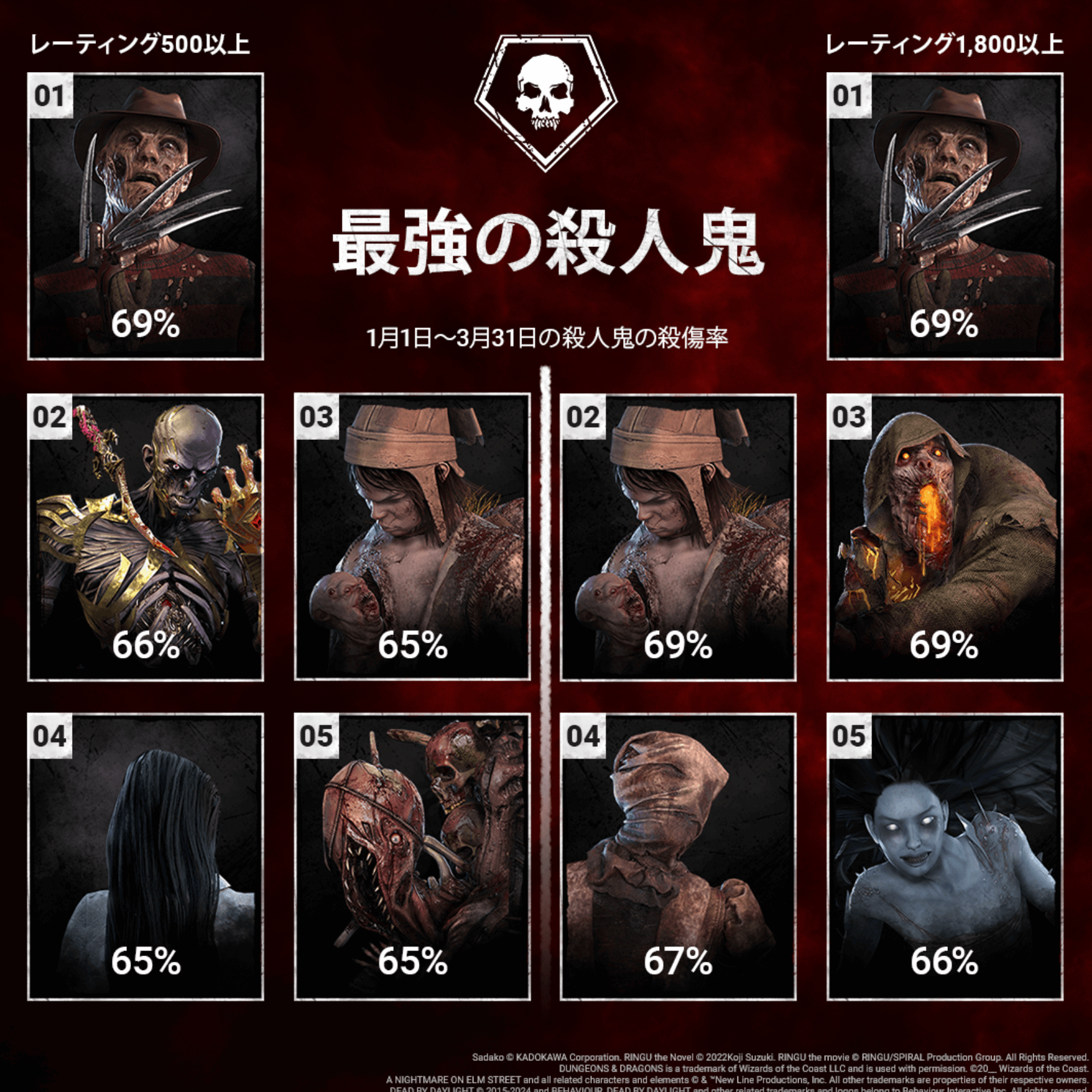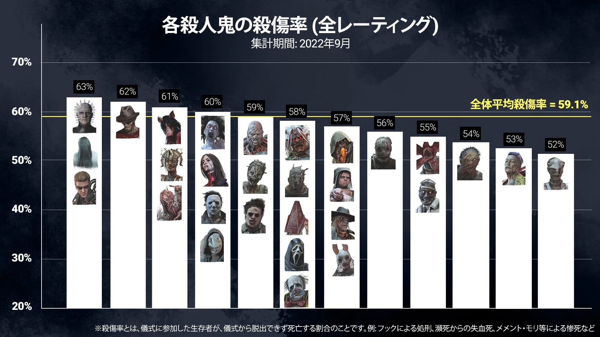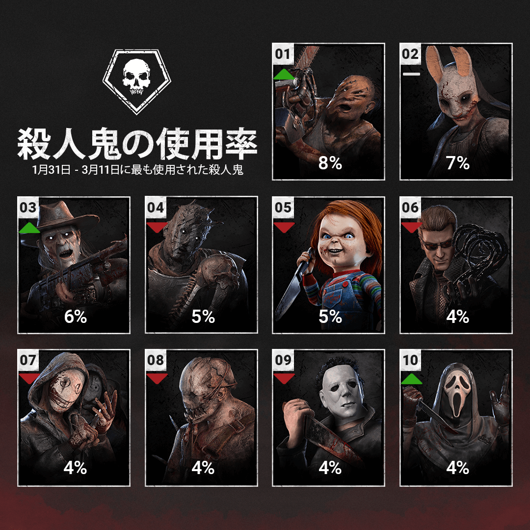 DbD(デッドバイデイライト)におけるキラーの殺傷率と使用率をランキング形式で掲載中!過去の全ランク(全プレイヤー)版と赤帯(ランク1~5)版、レーティング版の表に分けて掲載しているため、DbDで最新のキラー情報を知りたい方は是非参考にどうぞ!