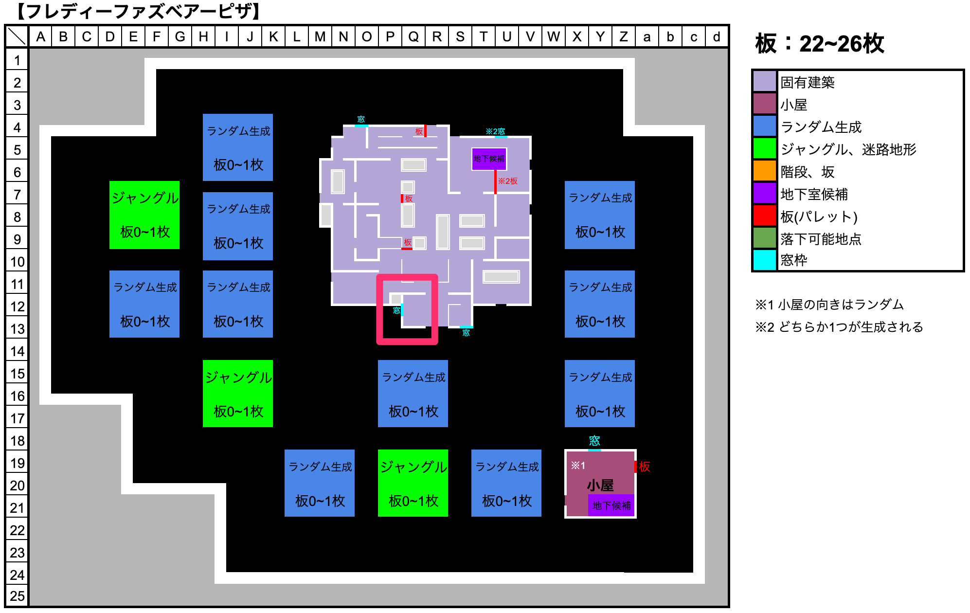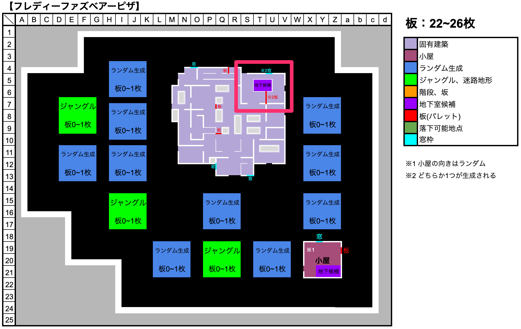 窓枠の代わりに板が1枚生成されるパターンも存在。板が生成された場合、窓枠ほど強力ではないが、板を割らないとチェイス時間が大幅に増加するため、ほぼ確実に板割りの時間を稼げる。