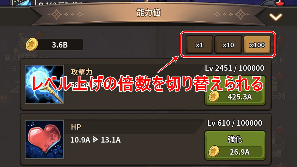 潜在能力強化は、1回の強化で上げるレベルの値を1・10・100から選ぶことが可能だ。レベル上げの手間を省略できるので、所持している「力の精髄」に合わせて活用しよう。