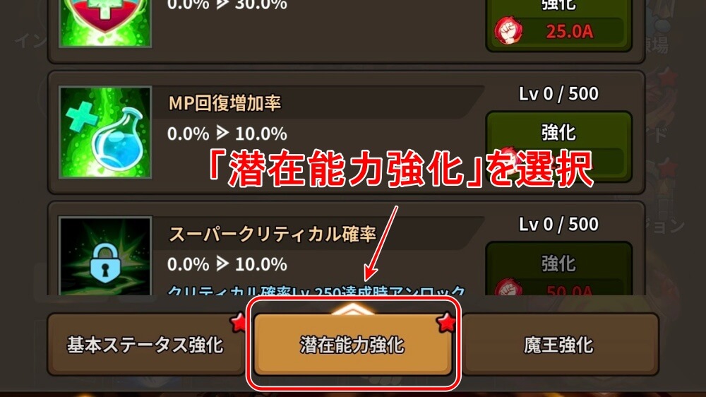 潜在能力を強化するには、画面左下の「能力値」から「潜在能力強化」を選ぶと、強化画面に移動できる。基本ステータスよりも強化要素が多く、自分の上げたい能力を強化すると良い。