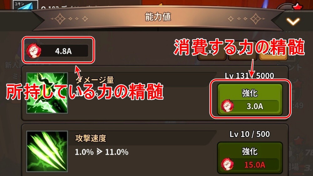 潜在能力強化には、「力の精髄」が必要だ。「力の精髄」は、レベルアップ報酬や宝石の鉱山で入手できる。基本ステータス強化に使うゴールドと比べると入手しづらく、強化によるステータスの上昇率は高くはない。