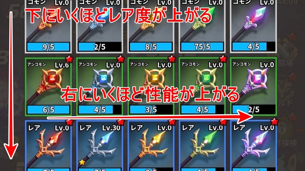 武器を強化する際は、所持している武器の中で最もレア度が高く、列の右端に近い武器を優先しよう。同じレア度の武器でも、列の右にいくほど性能が高くなっており、ガチャで出現する確率も低い。列の1番右の武器と、1つ上のレア度の1番左の武器では、レア度の高い方が優秀だ。