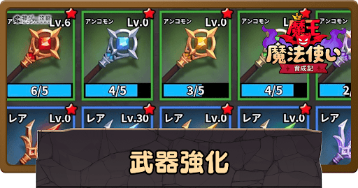 魔王魔法使い育成記の「武器強化」について解説。武器強化の優先度や強化方法、入手方法についても掲載中。武器を強化する際の参考にどうぞ。