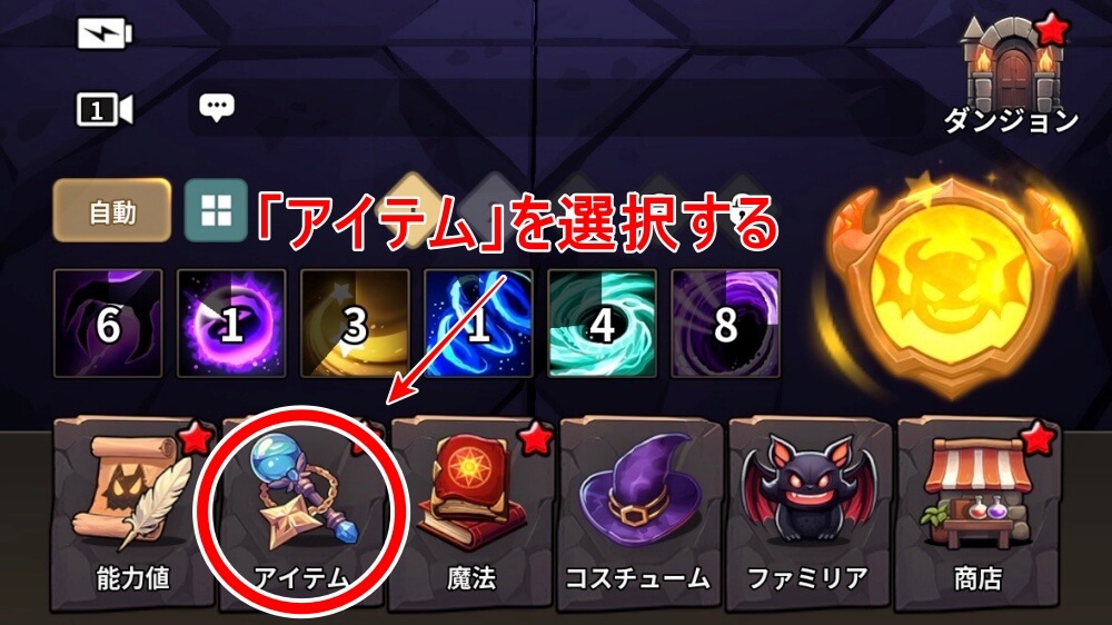 アイテムの「スタッフ」から武器を選ぶ