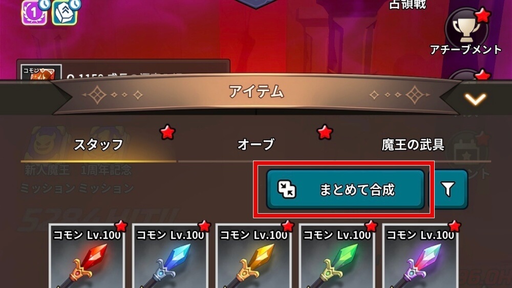 合成は、武器一覧画面の右上にある「まとめて合成」から一括で合成を行うことが可能だ。低レアの武器は溜まっていくので、基本的にはガチャを引いた後はまとめて合成を行おう。