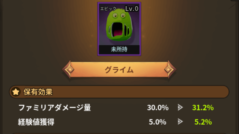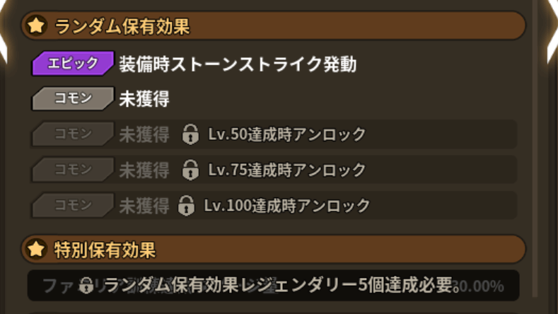 ファミリアは、上がったレベルに応じてランダム保有効果を追加で獲得可能になる。それぞれLv25ずつ上昇した時にアンロックされ、訓練場で訓練を行うと消費する時間に応じたグレードのスキルを入手可能だ。