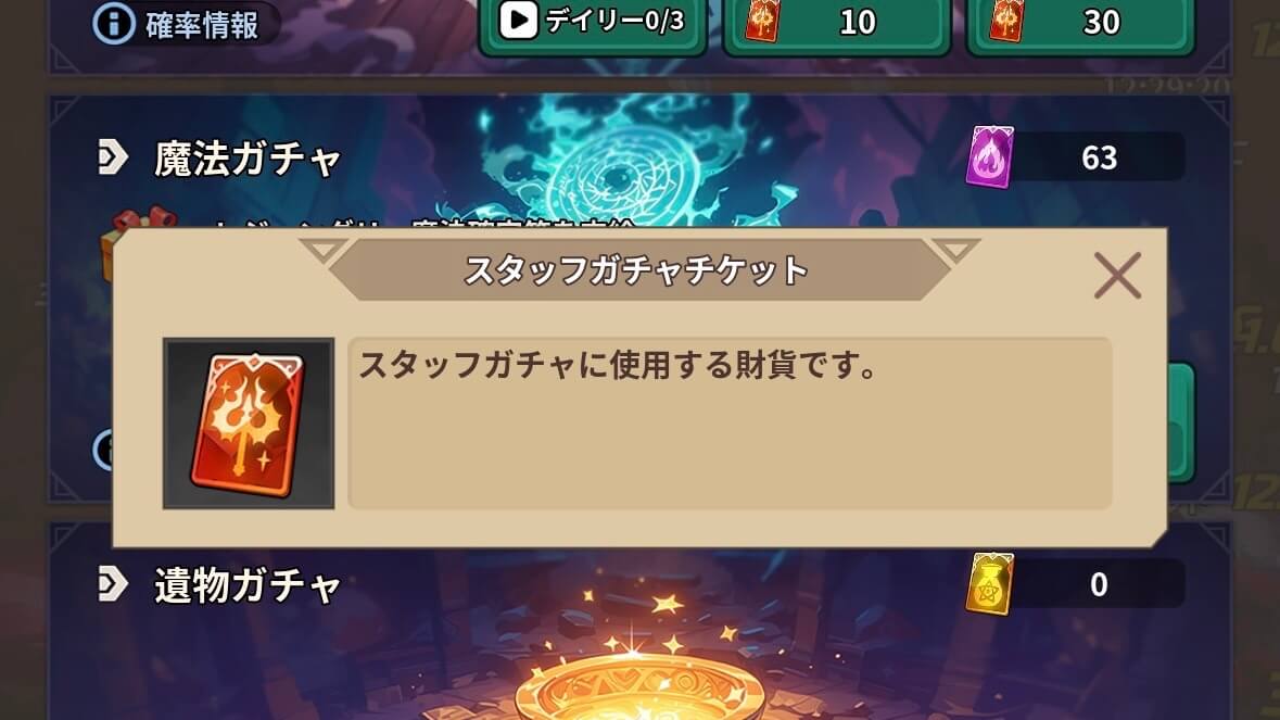 宝石でガチャを回せる「スタッフガチャ」「遺物ガチャ」「オーブガチャ」の中では、スタッフガチャがおすすめだ。レア度の高いスタッフを入手すると、キャラクターの火力に大きく影響するので、戦力アップしたいならスタッフガチャを回そう。