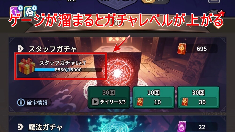 「スタッフガチャ」「オーブガチャ」は、ガチャを回すほどガチャレベルが上がる。ガチャのレベルが上がると、レアリティの高いアイテムが排出されるようになったり、排出確率が上がる。