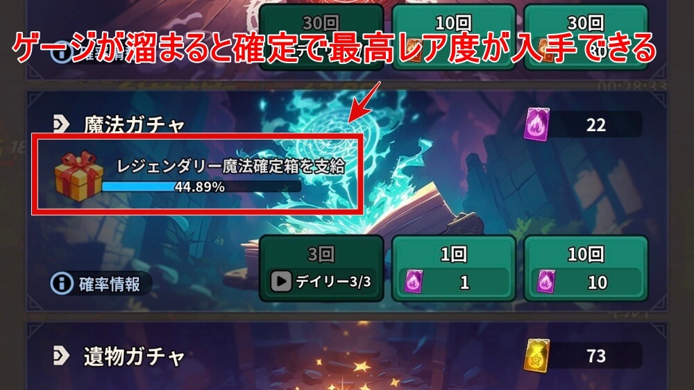 「魔法ガチャ」と「ファミリアガチャ」は、ガチャを回すとメーターが溜まっていき、マックスになると確定でエピックやレジェンダリー確定の宝箱が入手可能だ。他のガチャと違って宝石では回せないので、ガチャの救済処置が設けられている。