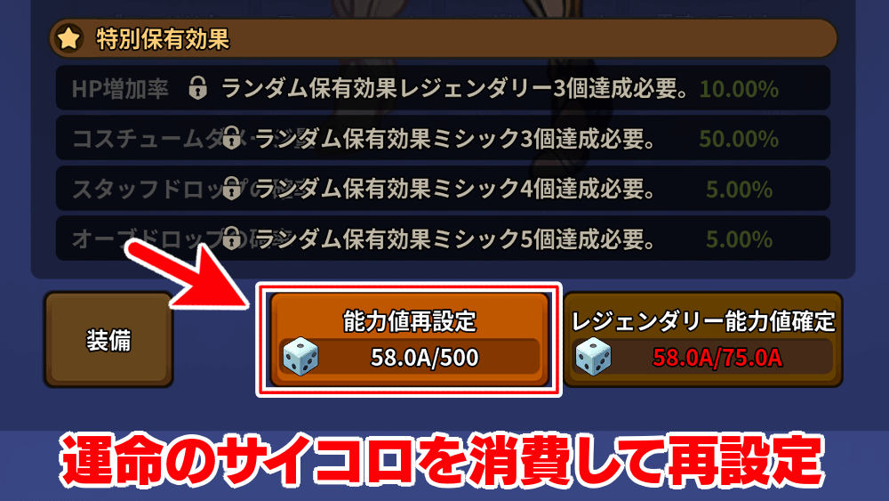 コスチュームの強化とは別に、コスチュームの保有効果を再設定することが可能だ。能力値の再設定は、運命のサイコロを消費して保有効果をランダムに再設定できる。固定したい箇所はロックも可能であるため、良い効果が出たらロックして他の箇所を再設定すると良い。