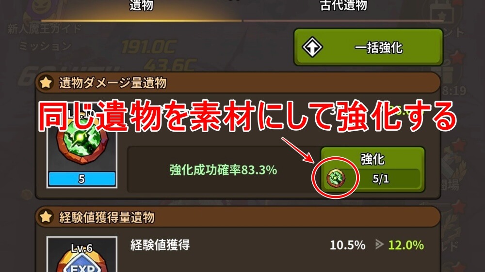 遺物は、同じ遺物を素材にして強化する。遺物はガチャで入手できるので、遺物を強化していきたい場合は、ガチャで同じ遺物を入手する必要がある。