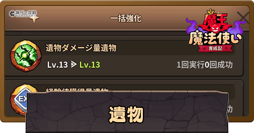 魔王魔法使い育成記の「遺物」について解説。遺物の種類や強化方法、入手方法についても掲載中。遺物を強化する際の参考にどうぞ。