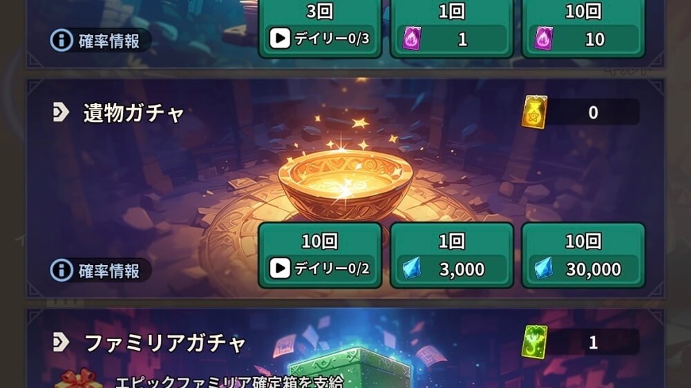 遺物は、遺物ガチャで入手できる。遺物ガチャを回すには、遺物ガチャチケットか宝石が必要。ガチャチケットはあまり入手できる機会が少ないので、すぐにレベルを上げていきたい場合は、宝石を消費して回すと良い。