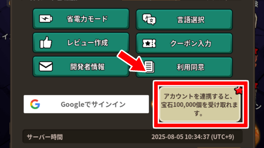 アカウント連携をすると、報酬として宝石を10万個受け取れる。宝石はガチャなどに使用するので、アカウント連携をして受け取っておこう。