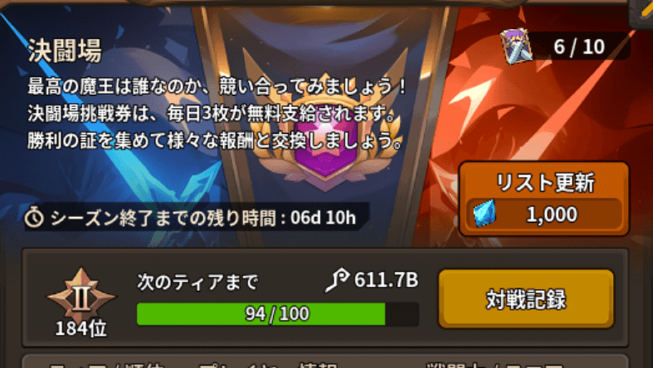 決闘場はLv350で解放されるコンテンツで、プレイヤー同士で戦ってランキングを競うコンテンツだ。挑戦券は毎日0時になると3回分獲得可能で、10回分まではためられるので、お触れないように消費しておくと良い。