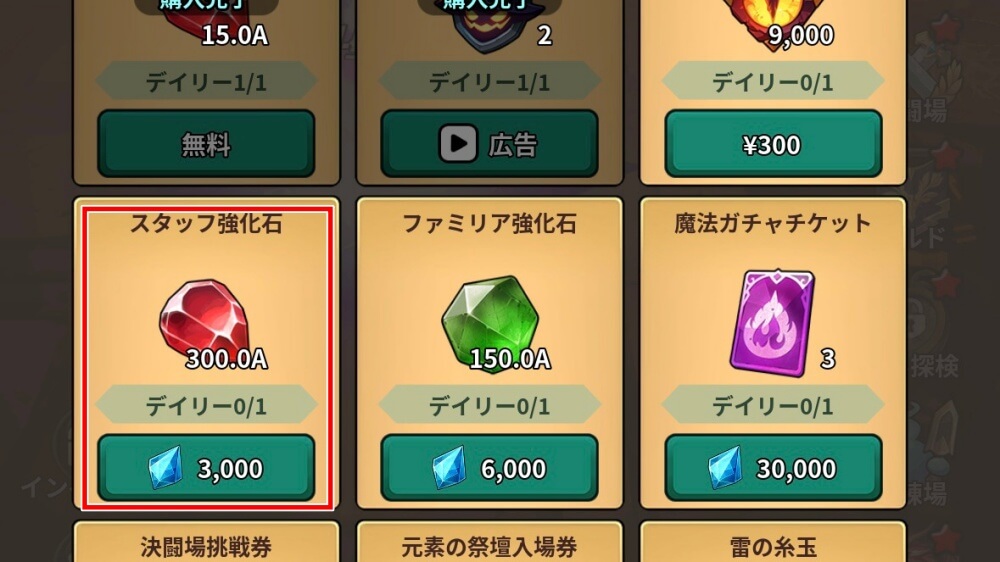 スタッフ強化石は、交換商店内のデイリー商店で交換できる。交換には宝石を使用し、1日に1回のみの交換なので、宝石に余裕があれば交換しよう。