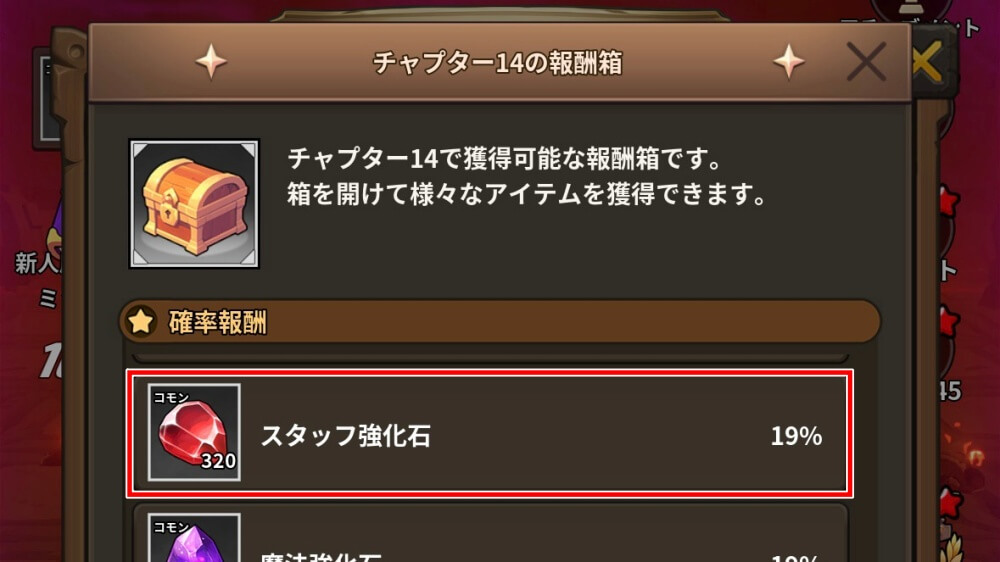 スタッフ強化石は、チャプターで入手できる報酬箱からも獲得可能だ。報酬箱はいくつかの報酬の中からランダム入手となり、必ず力の精髄を入手できるとは限らないので注意が必要だ。