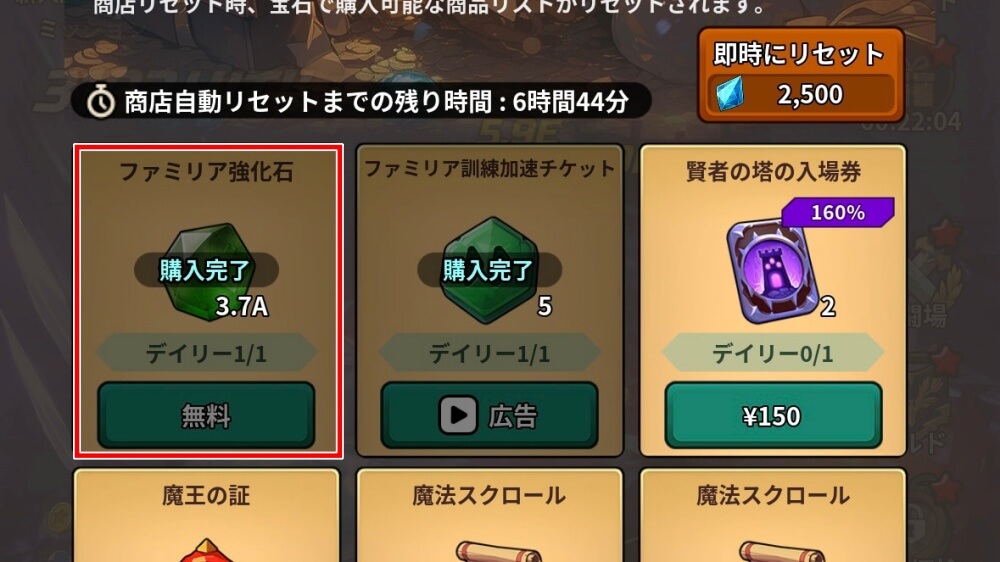 ファミリア強化石は、交換商店内のデイリー商店で交換できる。交換には宝石を使用し、1日に1回のみの交換なので、宝石に余裕があれば交換しよう。ランダムで広告視聴で入手できることもあるため、その場合は必ず入手するのがおすすめだ。