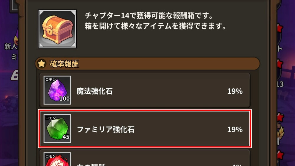 ファミリア強化石は、チャプターで入手できる報酬箱からも獲得可能だ。報酬箱はいくつかの報酬の中からランダム入手となり、必ずファミリア強化石を入手できるとは限らないので注意が必要だ。