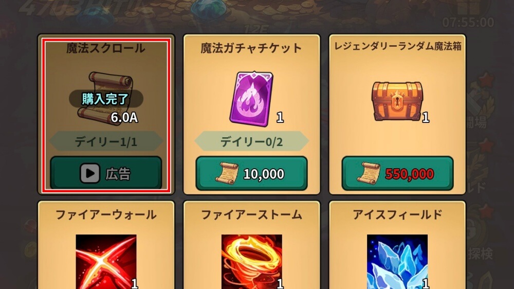 魔法スクロールは、魔法商店で入手できる。商店の中の魔法商店で、1日1回広告視聴をすることで魔法スクロールを6000個入手可能だ。必ず広告視聴して、毎日魔法スクロールを入手しよう。