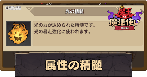 魔王魔法使い育成記の「属性の精髄」について解説。属性の精髄の入手方法や使い道について掲載中。属性の精髄について知りたい時の参考にどうぞ。