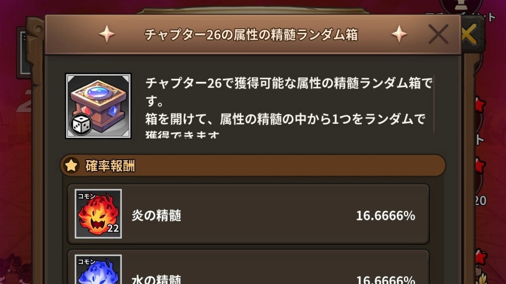 属性の精髄のランダム箱は、ステージでモンスターがドロップする。モンスターがランダム箱をドロップするのは、チャプター20以降で、各チャプターでドロップするステージは異なる。ランダム箱が欲しい場合は、ステージ情報を確認すると良い。