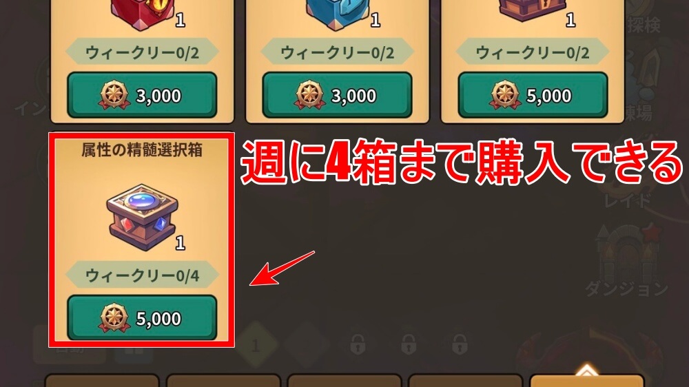 属性の精髄の選択箱は、商店の名誉ショップで入手できる。1週間に4つまで購入でき、大量に精髄を入手できるので、名誉の証に余裕があれば購入しよう。名誉の証は、ギルド占領戦で入手できるため、毎週ギルド占領戦に参加すると良い。