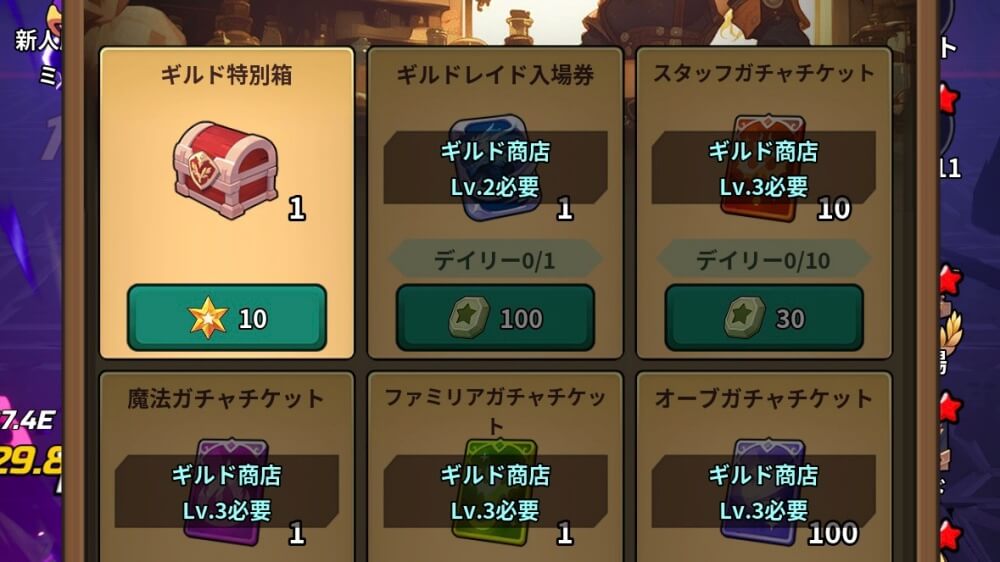 ギルドコインは、ギルド内に設置された商店でアイテム購入に使用する。ギルド商店では、ガチャチケットや精髄など、戦力強化に使えるアイテムが購入できるので、ギルドコインを入手したら活用しよう。