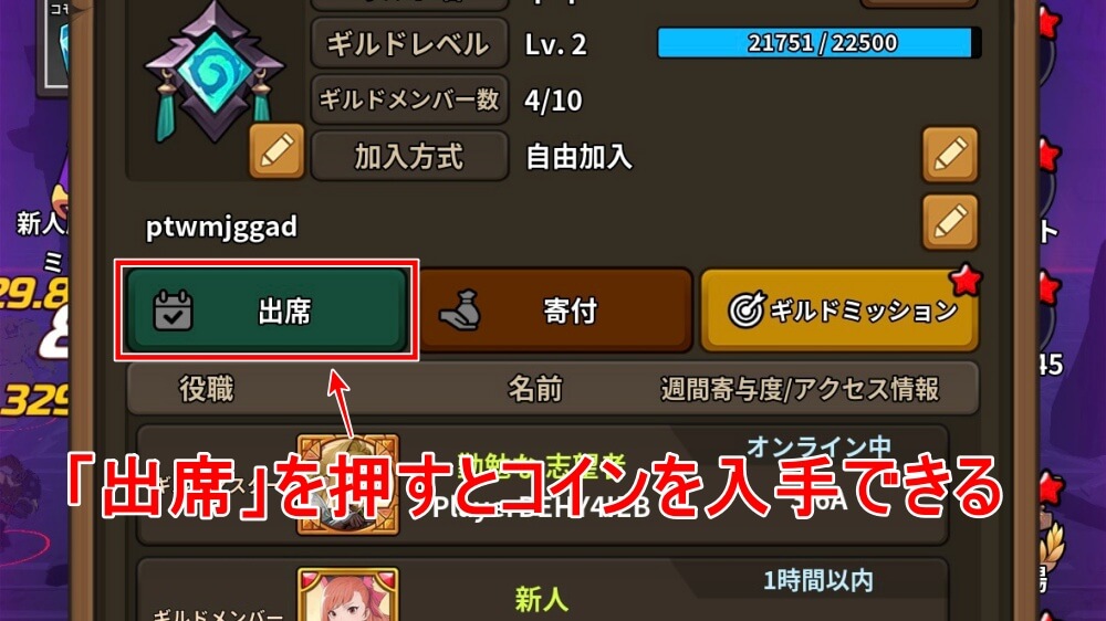 ギルドコインは、所属しているギルドに出席すると入手できる。ギルドの出席報酬は、ゲームにログインするだけでは入手できないので、所属しているギルドの「出席」を押して報酬を入手しよう。