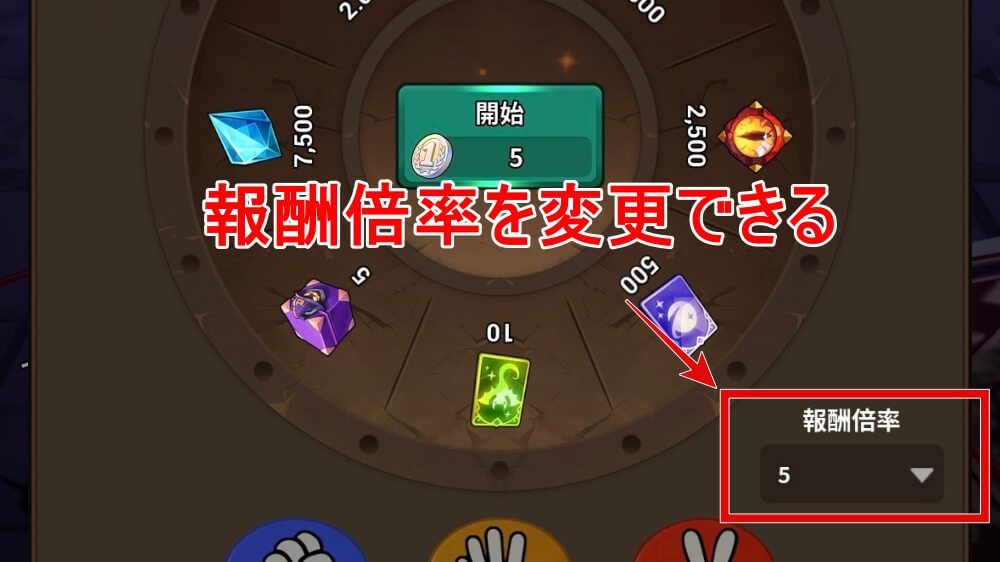 じゃんけんイベントは、じゃんけん前に報酬倍率を変更できる。最大5倍からスタートできるので、なるべく1周年記念を5枚集めて5倍で開始しよう。じゃんけんに勝つたびに報酬が倍になるため、5倍スタートで始めれば1回勝つだけで10倍になる。