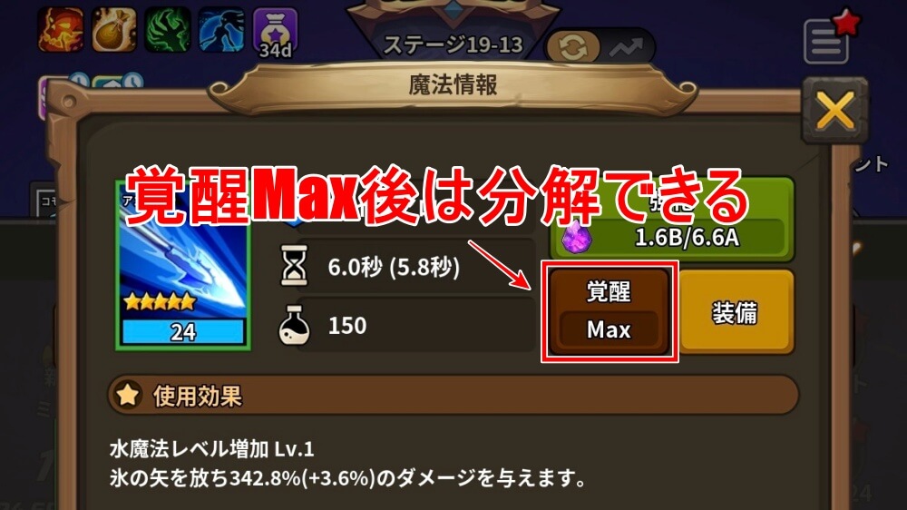魔法分解は、魔法を最大まで覚醒しないと分解できない。覚醒は5段階が最大で、最大まで覚醒するにはかなりの数の魔法が必要になる。序盤から分解して魔法スクロールを入手するのは難しいので注意しよう。
